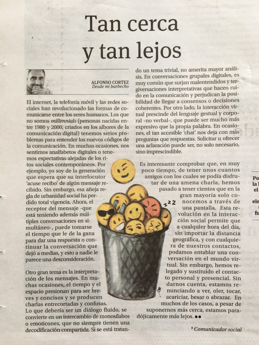 El internet, la telefonía móvil y las redes sociales han revolucionado las formas de comunicarse entre los seres humanos. Los que no somos millennials (personas nacidas entre 1980 y 2000, criados en los albores de la comunicación digital) tenemos serios problemas para entender los nuevos códigos de la comunicación. En muchas ocasiones, nos sentimos analfabetos digitales o tenemos expectativas alejadas de los ritos sociales contemporáneos. Por ejemplo, yo soy de la generación que espera que su interlocutor ‘acuse recibo’ de algún mensaje recibido. Sin embargo, esa añeja regla de urbanidad social ha perdido total vigencia. Ahora, el receptor del mensaje -que está teniendo además múltiples conversaciones en simultáneo-, puede tomarse el tiempo que le de la gana para dar una respuesta o continuar la conversación que dejó a medias, y esto a nadie le parece una desconsideración.