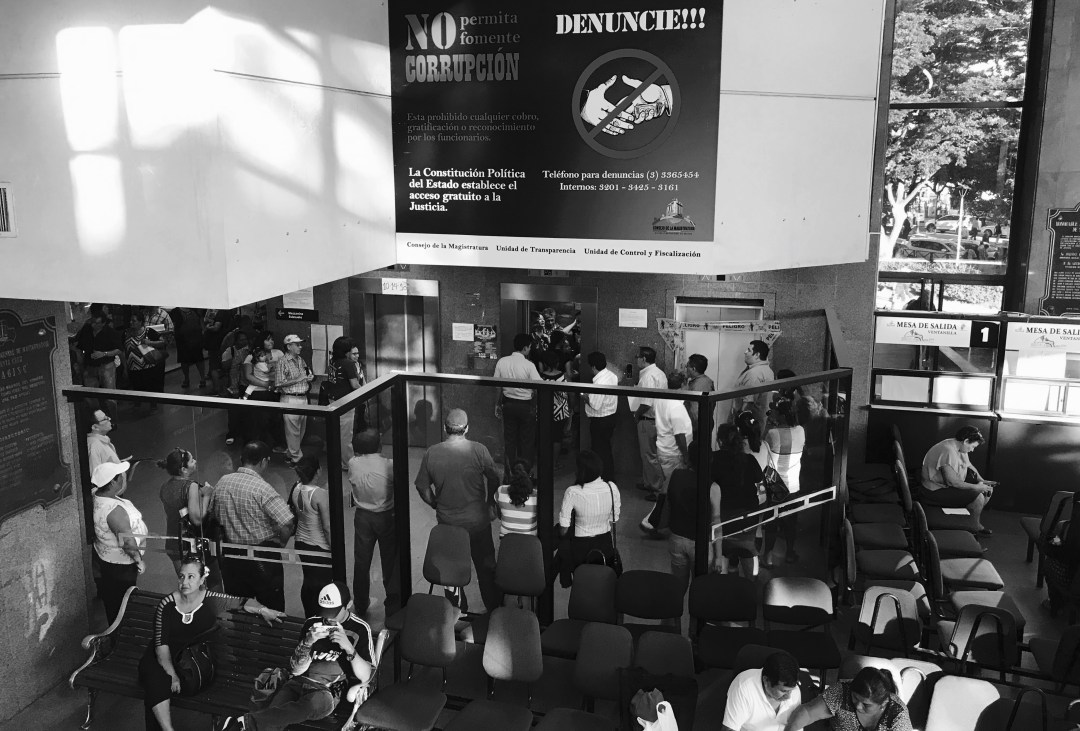Existen designados tres ascensores —con capacidad para ocho personas— para atender al público que quiere evitar los difíciles escalones. Una cinta plástica amarilla en las puertas de ingreso de la planta baja, sobre uno de ellos, señala claramente que hace mucho tiempo atrás está fuera de funcionamiento. El otro es ocupado, intercaladamente, para transportar a los detenidos y encausados con custodia policial. En las puertas del último que queda libre se forma una interminable fila de personas que —estoicamente— esperan su turno para que los transporten a algún piso cercano al juzgado donde se dirigen. En este mismo acceso se forma otra cola con adultos mayores, embarazadas y personas con algún impedimento físico. He sido testigo —al calor de la impaciencia y la impotencia que provoca la larga espera—, de rencillas entre las dos filas para determinar cuántas personas, de cada fila, deberían subir para dar mayor celeridad al proceso. Además de estos tres ascensores, existen otros dos destinados para jueces, fiscales, secretarios, asistentes, procuradores y casi un millar de funcionarios que trabajan en el palacio. No lo he visto, pero me han informado que hay otro ascensor que une el subsuelo directo con el piso de presidencia.