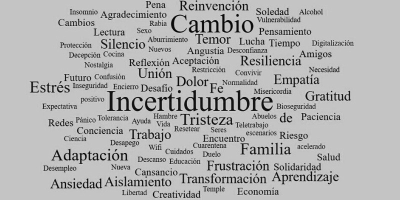 Impotencia Solidaridad Pérdida Rabia Dolor Abrazos Besos Voluntad Positivismo Familia Servicio Tolerancia Soledad Silencio Creatividad Comprensión Aceptación Paz Amor Aislamiento Angustia Esperanza Normalidad Protección Prevención Síntomas Afecto Encuentro Restricción Contención Piel Conciencia Presencia Prudencia Conexión Expectativa Aprendizaje Serenidad Lucha Disciplina Imaginación Redes Virtualidad Vida Muerte Curiosidad Expectativa Ayuda Colaboración Aprendizaje Enseñanza Temor Carencias Fe Adaptación Construcción Consumo responsable Medio Ambiente Susto Pánico Terror Miedo Incertidumbre Zozobra Coyuntura Morgue Confinado Cuidar Resistir Ayuda Angustia Desesperación Dios Unión Cambio Nueva visión Bien común Crisis Resiliencia Creatividad Reto Paciencia Adaptación Aceptación Reajuste Teletrabajo Oportunidades Transformación Teleeducación Superación Renovación Comunicación virtual Miedo Acomodo Aguante Incertidumbre Compañía Armonía Cansancio Frustración Equilibrio Multifacético Paciencia Encuentro Superación Miedo Autocontrol Empatía Tristeza Nostalgia Asentir Integrar Psicosis Sanitizar Reinventar Normativas Desobediencia Riesgo Histeria Valorar la vida Juego de cartas Desorden Trapeador Lectura Tareas escolares Sanidad Fragilidad Cuidar Amar Pena Vulnerabilidad Cocina Metamorfosis Conciencia Limpieza Ausencia Tiricia Postergar Hambre Pobreza Necesidad Valoración Alimentación nutritiva Virtualidad Pánico Oxígeno Cambios Apego Oportunidades Cambalaches Desregulación Libido Discernimiento Ciencia Desapego Oración Sensibilidad Fortaleza Unión Búsqueda de dios Estrés Incertidumbre Energía Autocontrol Cansancio Lectura Reflexión Finitud Muerte Familia Preocupación Hambruna Dolor Insomnio Distanciamiento Descubrimiento Histeria Convivencia Trabajo Fanatismo Creatividad Horizonte Crecimiento Empatía Dificultad Desesperación Futuro Incertidumbre Estrés Inseguridad Frustración Ansiedad Resetear Reinvención Claustrofobia Humildad Desafío Aislamiento Informática Distopía Confinamiento Encierro Quimera Fanatismo Irrealidad Desasosiego Desazón Desolación Silencio interior Trabajo manual Emociones Oración Tristeza Tiempo Duelo Melancolía Fortalecer vínculos Amigos Lección Gratitud Autocuidado Sumisión Viento Teoría conspirativas Azar Libertad Mudez Murciélagos Encuentro Esquina Eco Origen Gratitud Cambio acelerado Transformación Pensamiento positivo Nuevos escenarios Enojo Soledad Hambre Trabajo Desempleo Charlatanes Tiempo Restricción Ignorancia Alcohol Barbijo Libertad Ficción Necesidad Salud Economía Misericordia Lucha Resistencia Impotencia Nervios Tristeza Creación Agradecimiento China Conformidad Adaptación Estrés Encrucijada Protección Cuidados Seres queridos Cambio Política Frigidez Negación Ignorancia Lectura Comienzo Política Impotencia Hogar Vecinos Apoyo Bicicleta Oración Sensibilidad Fortaleza Unión Esperanza Solidaridad Ciencia Desapego Tranquilidad Venecia Respiro Final Compasión Cuarentena Resiliencia Abuelos Fe Alimentos Wifi Agradecimiento Tecnología Integración Compañerismo Corrupción Desprendimiento Concientización Ansiedad Cambio Crecimiento Pensamiento creativo Iniciativa Amigos Reuniones Internet Zoom Noticias Cocinar Sexo Alcohol Gel Silencio Hogar Temor Bioseguridad Convivir Economía Educación Incertidumbre Oportunidad Descanso Riesgo Reinvención Alejamiento Digitalización Cambio Lazos familiares Nuevas experiencias Incertidumbre Dolor Aislamiento Pena Impotencia Amargura Fortaleza Temple Incertidumbre Inutilidad Teletrabajo Homeschool Limpieza Encierro Internet Redes sociales Libros Perplejidad Oportunidad Descanso Riesgo Reinvención Alejamiento Digitalización Cambio Desencuentros Intolerancia Empatía Esperanza Celos Ruptura Fin Incertidumbre Pena Dolor Fortaleza Temple Gratitud Espiritualidad Esperanza Impotencia Rebeldía Reflexión Inapetencia sexual Resistencia Vulnerabilidad Relaciones Cambios Adaptación Tolerancia Aprendizaje Desconfianza Caos Aburrimiento Ilusión Futuro Temor Nostalgia Fuerza Postergación Saudade Paréntesis Familia Insomnio Zoom Netflix Bicicleta Cocina Vino Cuarentena Resiliencia Fe Abuelos Oportunidad Drogas Solidaridad Cambios Cuidados Seres queridos Sentimientos negativos Miedo Estrés Tristeza Impotencia Frustración Ansiedad Rabia Vergüenza Disgusto Confusión Remordimiento Aburrimiento Arrepentimiento Decepción Confusión Irritabilidad Esperanza Confianza Admiración Empatía Sexo Cortesía Emoción Amor Descortesía Deseo Coraje Alivio Orgullo Sorpresa Introversión Seriedad Pasividad Sedentarismo Simpatía Impotencia Decepción Incredulidad Desconfianza Respaldo Unidad Nueva normalidad Adaptación Cambio de Mindset Aprendizaje Optimismo Reinventarse Desafío Oportunidad Gratitud Salud Unión de fe Oración Valorar lo vivido Introspección Reflexión Autoconocimiento Duelo Desesperación Cambio acelerado Transformación Reinvención Pensamiento positivo Nuevos escenarios Miedo Incertidumbre Estrés Inseguridad Frustración Ansiedad Oportunidad Resetear Conciencia Aceptación Compasión Integridad Transformación Temor Bioseguridad Convivir Economía Educación Impotencia Angustia Desafío Paciencia Tranquilidad Estudio Futuro Resiliencia Cuarentona Tristeza Resignación Lucha Silencio Equivocación Soledad Plata Trabajo Pantalla Redes sociales Exceso Cansancio Miedo Aislamiento Desempleo Celular Medicamentos Eucalipto Esperanza Ánimo Amigos Familia Tiempo Salud Dólares Platos Des-pensar Familia Agradecimiento Misericordia Alimentos Wifi…