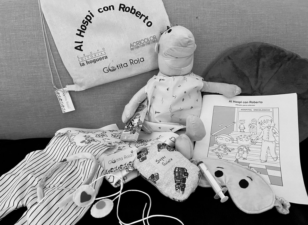La magia se acrecienta cuando las madres de los niños, organizadas por Gotita Roja —una asociación sin fines de lucro que apoya a los pacientes del oncológico—, deciden hacer muchos Robertos para que cada niño que se hospitalice reciba en un kit de bienvenida: una mochila; el peluche Roberto, con su bata y una muda de ropa; el libro didáctico, Al Hospi con Roberto; los juguetes de Roberto (antifaz, suero, catéter, estetoscopio) y un set de colores para pintar la guía.
